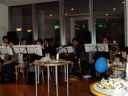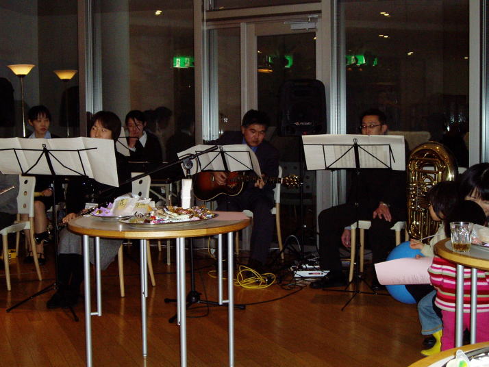 JETプログラムの外国人の方がたくさん。みんなで合唱の伴奏 編成 フルート、クラリネット、キーボード、チューバ、ギター、リズムセクション 演奏曲 涙そうそう、世界で一番の花