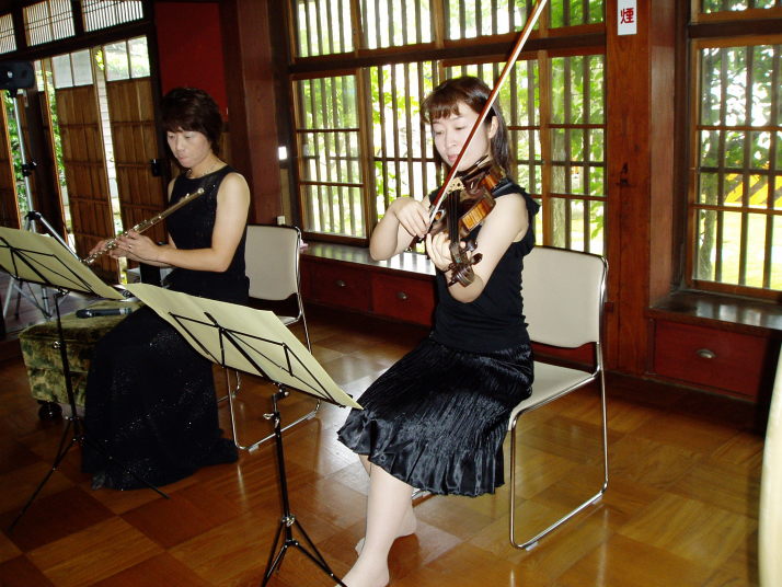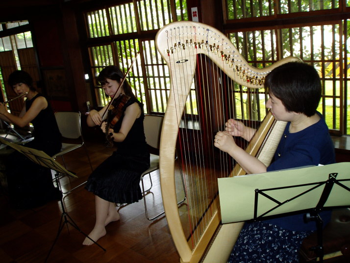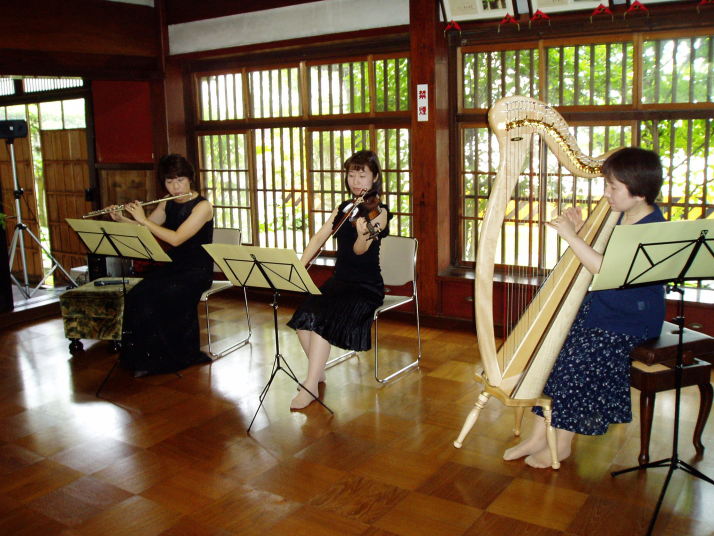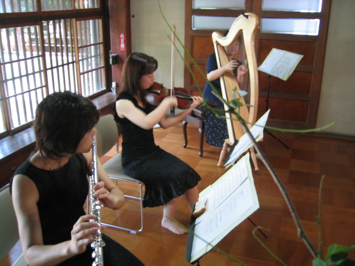 女性3名の編成で涼しげに演奏しました。のりえさんのハープのデビューです。