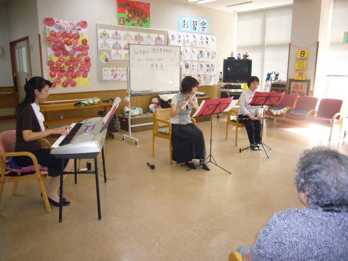 初めて訪問する施設で、しかも3人だけの演奏ということで最初、少し緊張しましたが、楽しんでいただけたと聞いてホッとしました。職員の方の手作りケーキもおいしかったですネ。癒されました。土・日は施設がお休みですが、祝日は開いているそうです。次回、機会があったらみんなで行けたらと思います。 |