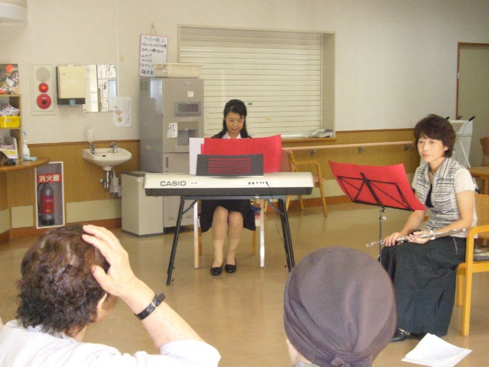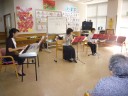 3人だけの演奏は不安でしたが、ディサービスに顔見知りの方がいて、ちょっとほっとしました。『ああ人生〜』ではとても大きな声で合唱してくれたり、『幸せなら手を〜』ではノリのいい職員さんのリードのおかげで、楽しく演奏できました。(演奏を終えてもまだ続いていたのが印象的です)最後の『ふるさと』の演奏を終えると、「涙が出そうになったわ」と優しい言葉をかけてくださり、本当に来てよかったと思いました。また、みんなで行きたいですね♪のりこさんのMCとてもよかったです。 |