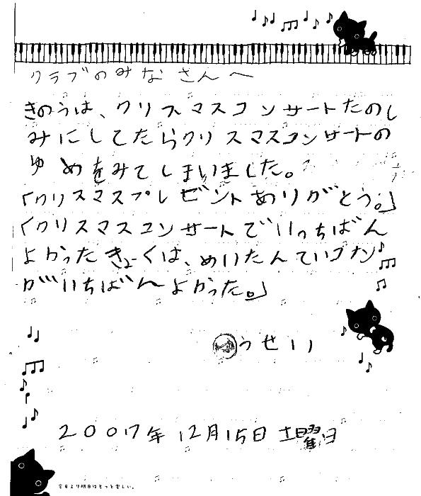 きよしこの夜〜サンタが町にやってくる、ジングルベル、さんぽ〜となりのトトロ、にんげんっていいな、サザエさん、名探偵コナン、一期一会、カノン、犬のおまわりさん、大きな古時計、ディズニーメドレー