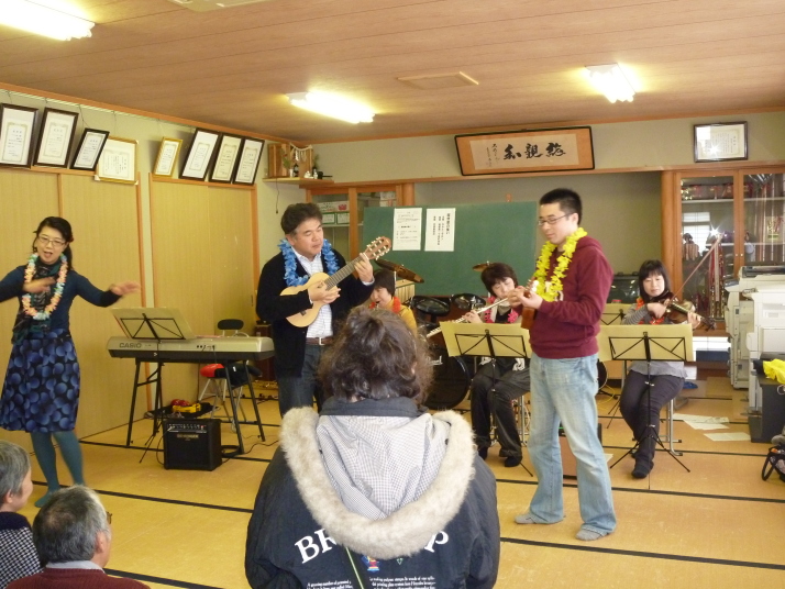 きのうはおつかれさまでした。練習不足でいっぱい間違えましたが、他のメンバーの演奏がすばらしくて、「春なのに」はマラカスの手がとまるくらい聴き入ってしまいました。とてもよかったです。水戸黄門のセリフもドッと笑いがあり、アロハオエもたくさんの人が一緒に踊りに参加してくださり、ウクレレのたけしさんやかずやさんも前に出て一緒に踊ってくれて、本当に楽しく盛り上がることができました。最後に「アロハ〜」のセリフを言い忘れてしまうほどでした。「幸せなら手をたたこう」も観客参加型が2曲続けてあってよかったです。