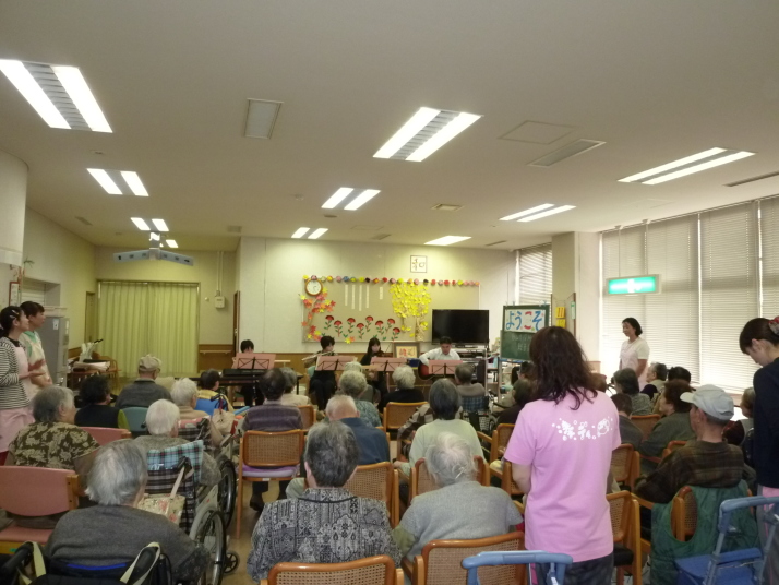 | ●かよ | 思ったよりたくさんの方がおいでましたね。 デイの職員の方が盛り上げてくださったので、みなさんも 手をたたいたり歌ったり踊ったりと楽しそうでした。 演奏の面では、直前練習がなく本番に突入だったので ちょっとドキドキしました。のりこさんがすぐに帰らないといけなくてとても残念 だったのですが、お誕生日ケーキとてもおいしかったです☆ |
