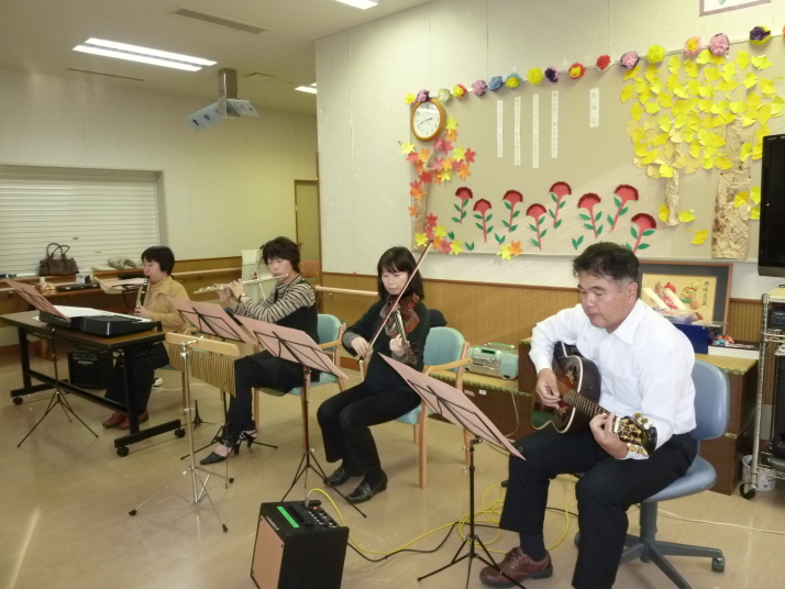 | お誕生会を兼ねた演奏会でした。メンバーは4人で、のりえさんは一曲中にキーボードとクラリネットの演奏を披露しました。 |