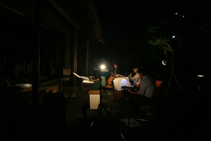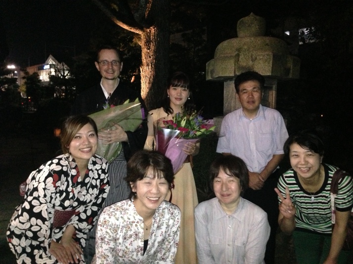 | 日本庭園で、月夜に演奏しました。演奏後、メインのギター尺八の方々と記念撮影。尺八はルーマニアの方です。 |