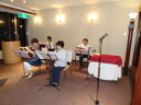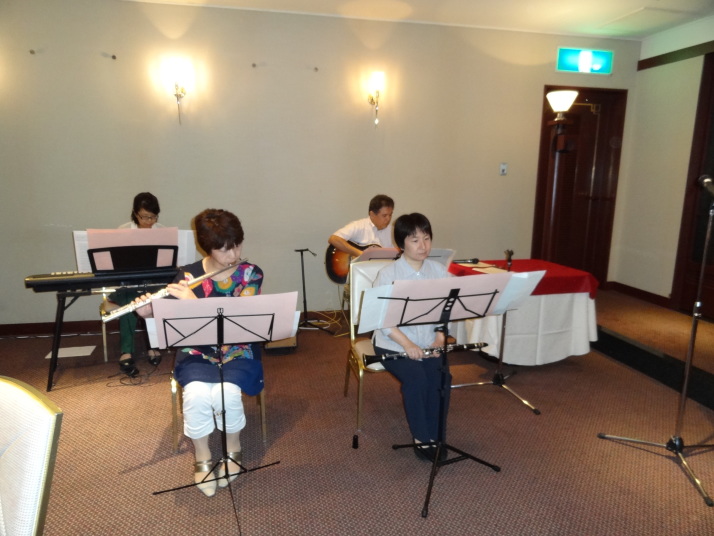 | プロバスクラブ松任の観月会での演奏です。参加者のみなさんは人生をとても楽しんでいらっしゃる方々で、今回は、月を観ながら食事とお酒と音楽を楽しんで・・という会で、会場の雰囲気にも合わせ、少人数での演奏です。 |