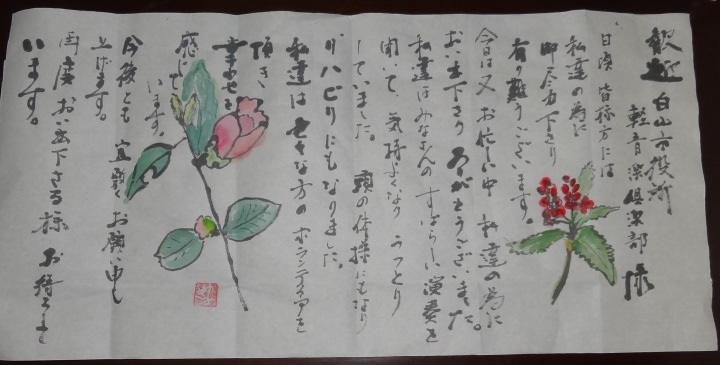 | ●たけし | あいのきデイはお疲れさまでした。 スタートが予定より15分繰り上がったのに、終了時刻は予定通りということで約45分間の本番となりました。念のために持って行った楽譜もみんな演奏できて、また、会場のみなさんに喜んでいただけたようで、よかったです。午前中に練習できたおかげで、大きなミスもなく、演奏できました。 |