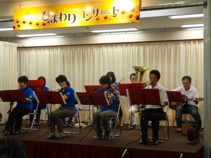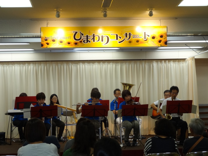 | 公民館の行事で3年目を迎えるひまわりコンサート。地元中学生の木管ユニット、金管ユニット、そのあと地元在住の高校生によるピアノとフルート、声楽の演奏のあと、3組目として演奏しました。 |