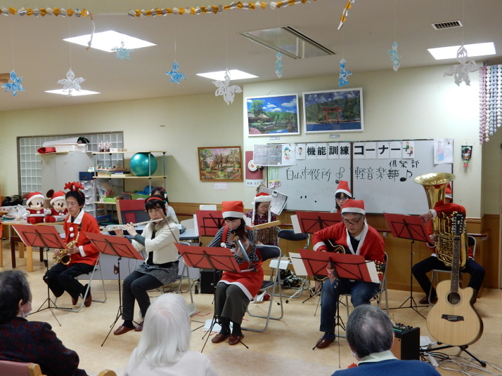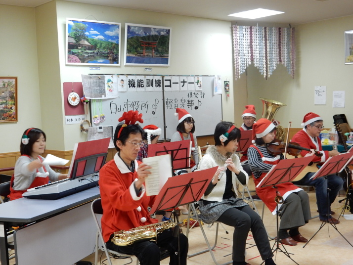 久しぶりにサンタの衣装をみんなで身に着けると、クリスマスの雰囲気が伝わり、演奏にも力が入りました。 |