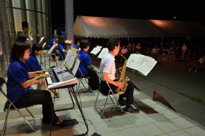 イルミネーション点灯のオープニングイベントでの演奏です。地元の太鼓、市消防音楽隊のあと、演奏しました。かなさんがユーフォニアムで参加しました。